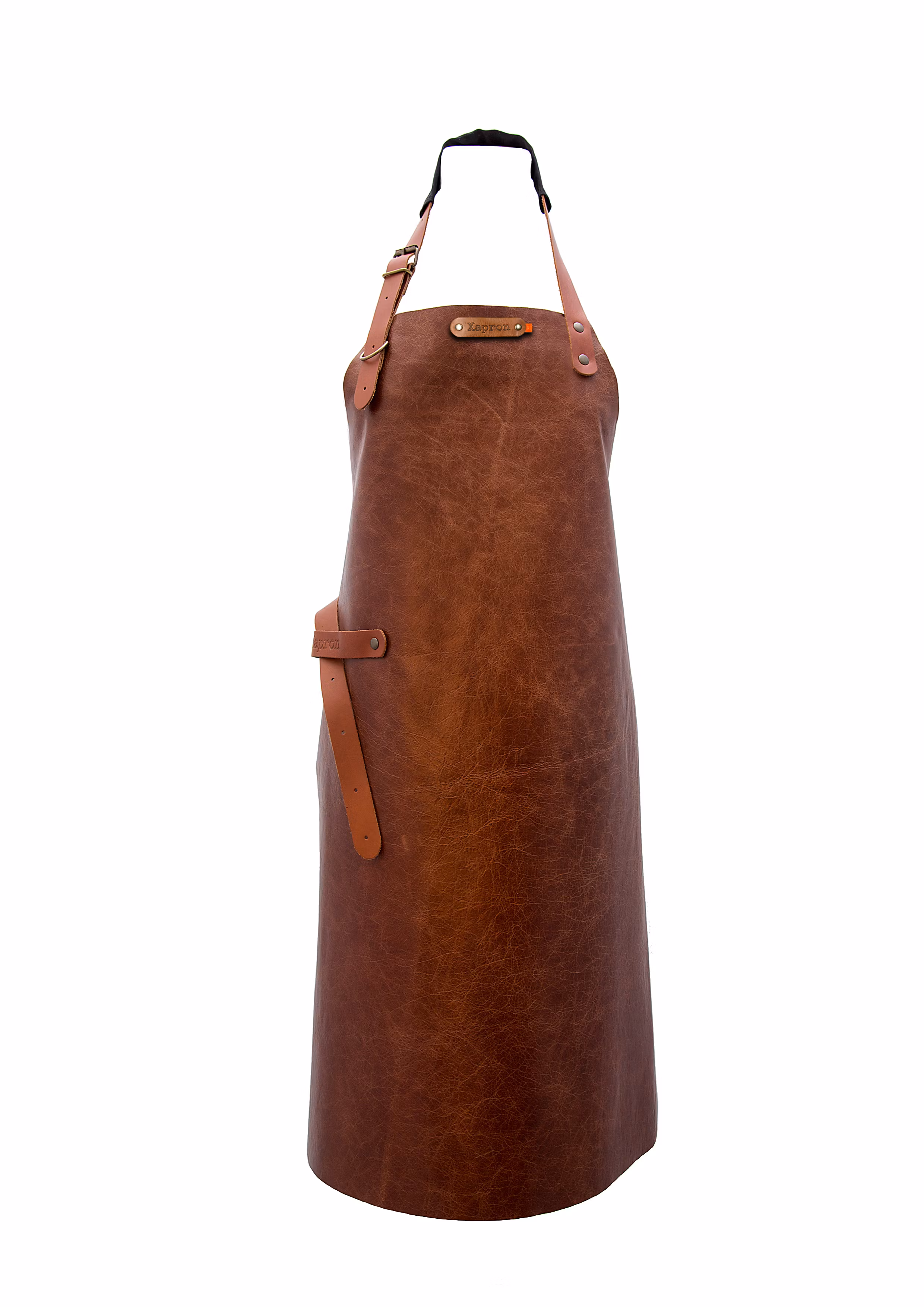 Handgjorda skinnförkläden finns i två färger: Brown och Black och tre längder: 74 cm (60 cm bred), 82 cm (60 cm) och 89 cm XL (70 cm) Förklädena har enkla och juterbara spännen och slag för handduk.